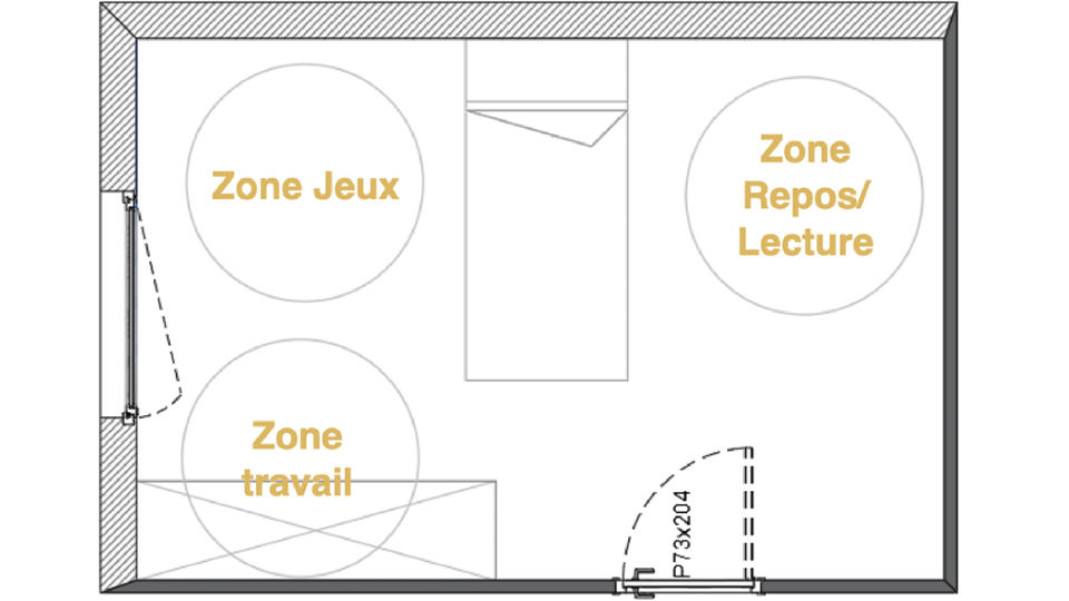 Côté technique, ma réflexion s'est portée tout d'abord sur le découpage de l'espace de façon à pouvoir créer une zone repos, une zone jeux et une zone travail/concentration et proposer ainsi un plan zoning puis un plan 2D avec les cotes ainsi qu'un plan d'aménagement.